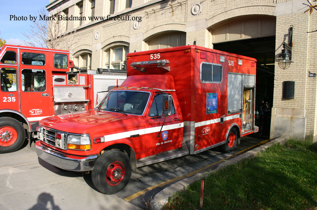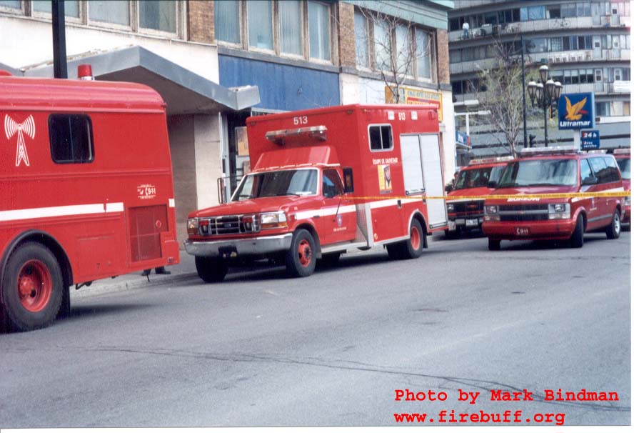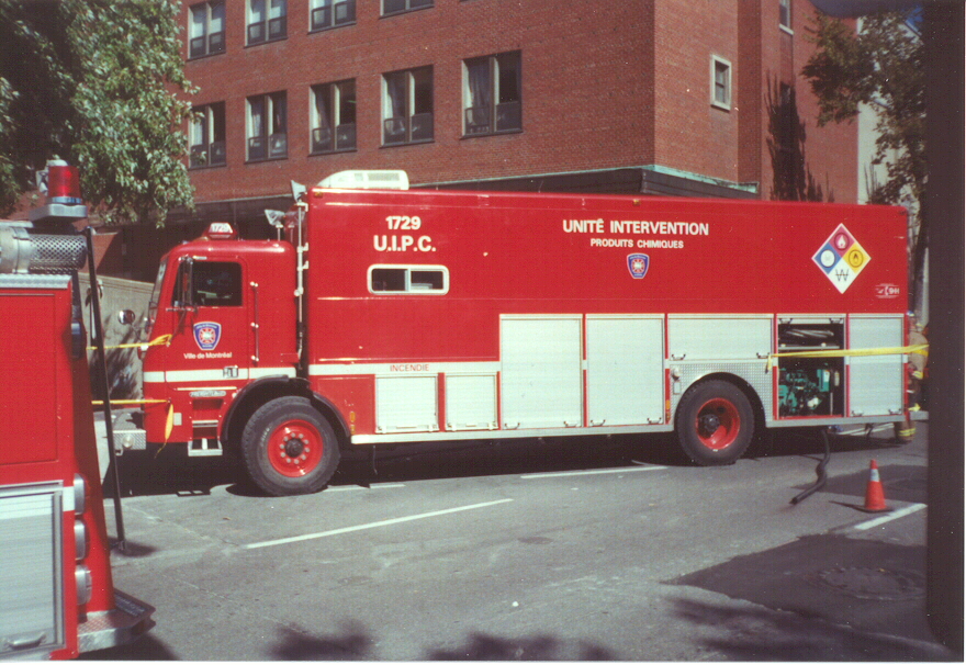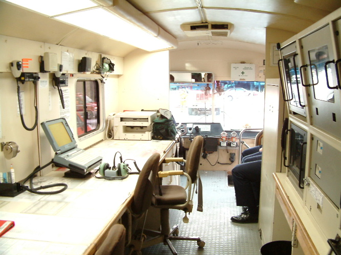 | Former Command Post 1005 1988 Bluebird Coach. This command post has computer links and screens tied into the main computer network of the Montreal Fire Department. It has 3? radio positions, a conference room, and other facilities. It has cellular phones, fax machines and a small library on board. It is based at station 5 located at 75 Ontario Street E. just east of Blvd. St. Laurent. (All of this description is from memory so please excuse any errors or omissions.) The following interior photos of the command post are provided by Michel Latour 1005b.JPG, 1005c.JPG | |